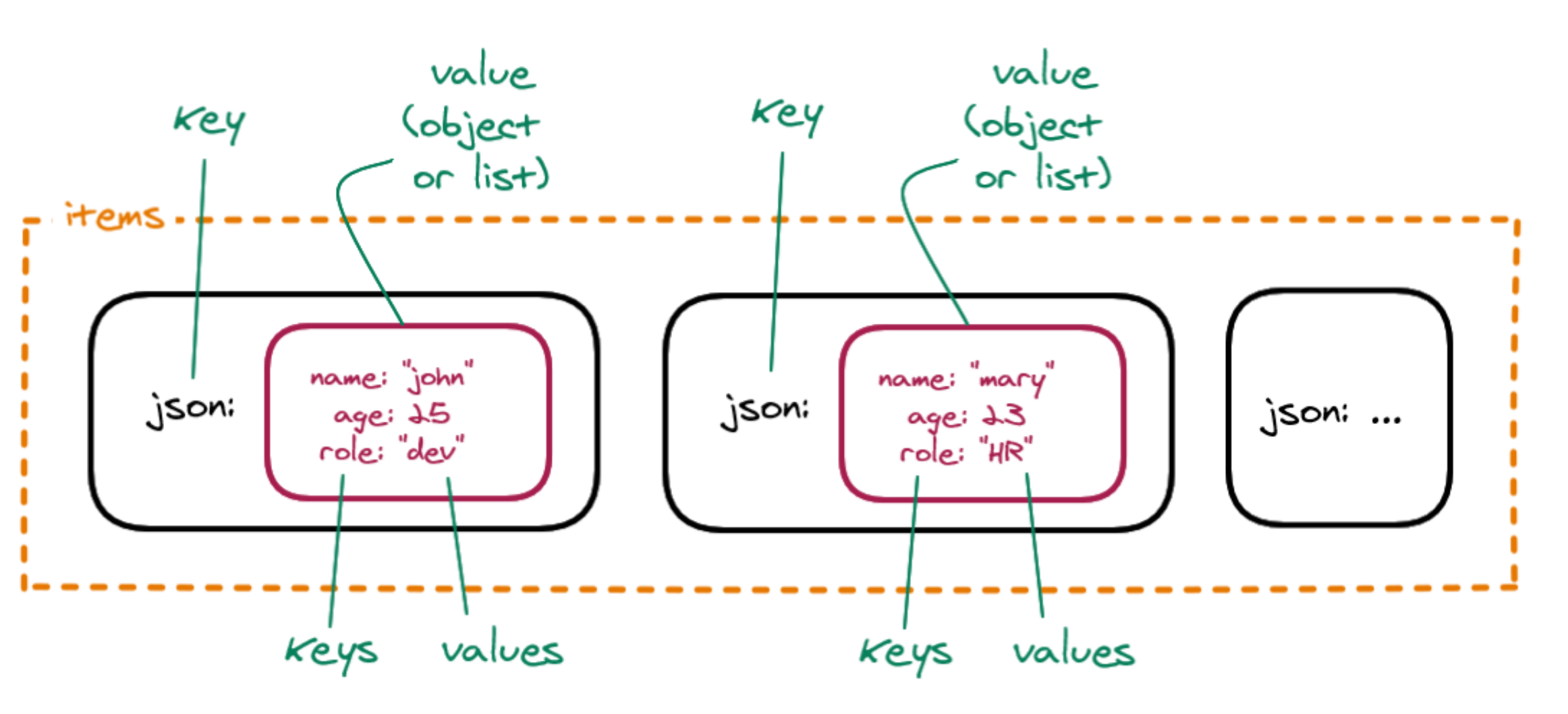 Data sent from one node to another is sent as an array of JSON objects. The elements in this collection are called items.